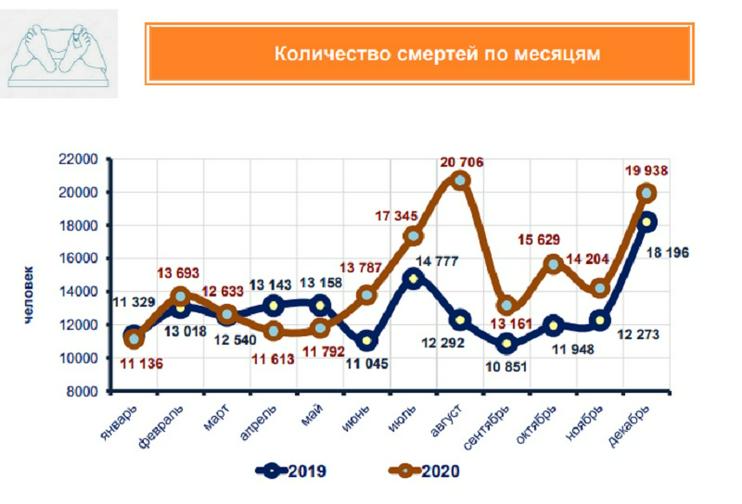 Из общего числа зарегистрированных смертей за январь-декабрь 2020 года 60% приходятся на болезни системы кровообращения, 8% — новообразования, 7,2% — болезни органов дыхания, 4,4% — болезни органов пищеварения, 4,4% — несчастные случаи, отравления и травмы, 4,4% — инфекционные и паразитарные заболевания и 11,6% — другие болезни.