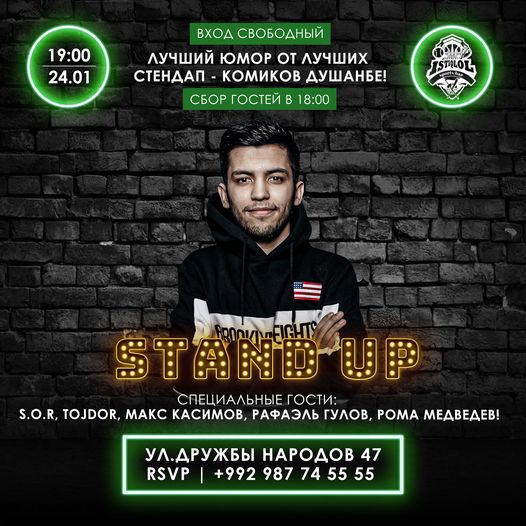 Также, в это воскресенье, 24 января, в 19:00 Спорт-бар "Истиклол" приглашает на Stand Up! Сбор гостей в 18:00, места ограничены!