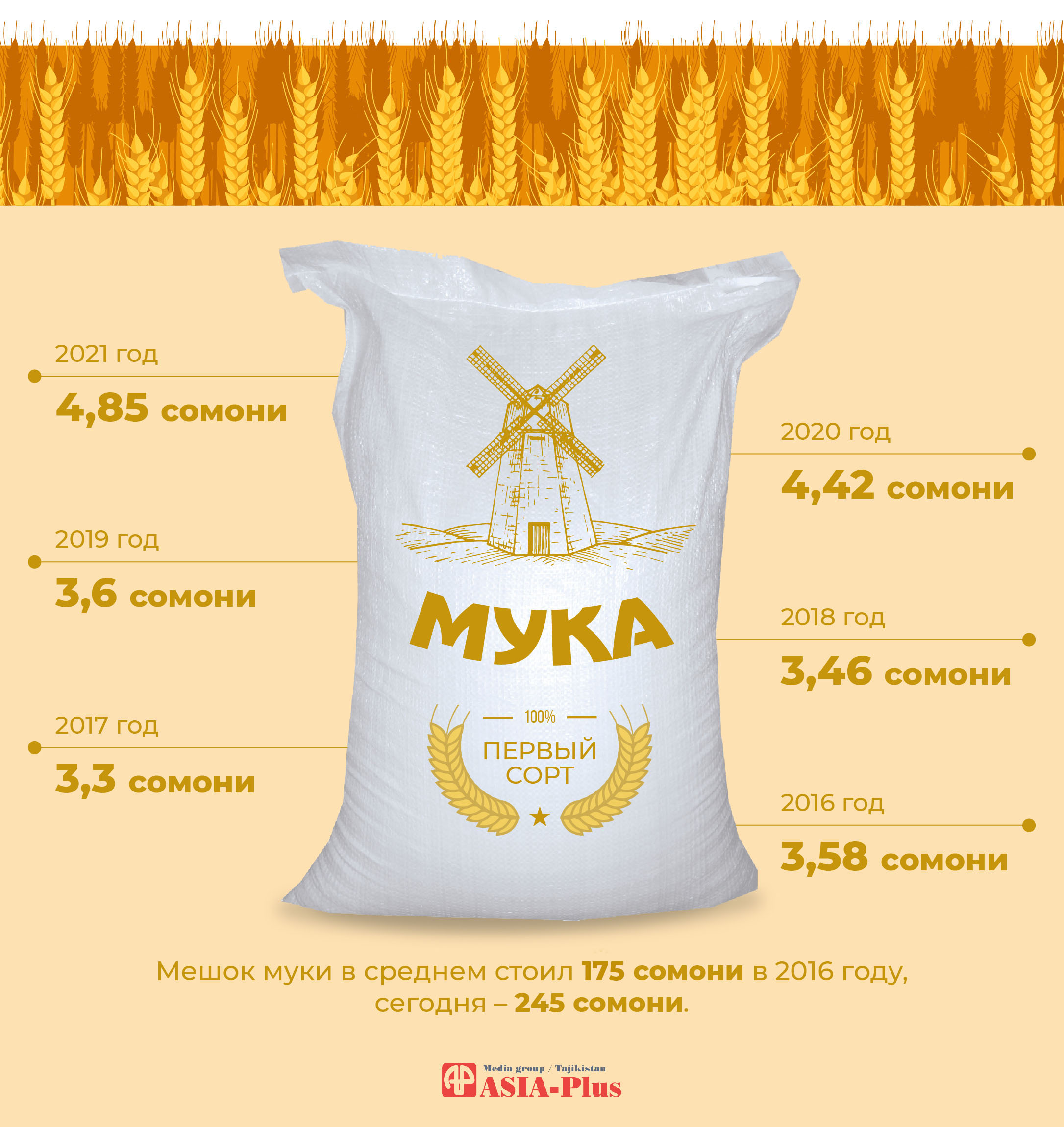 В начале января 2021 года средняя цена на пшеничную муку 1-го сорта в Таджикистане составила 4,85 сомони. А за последние 5 лет цены изменились следующим образом: