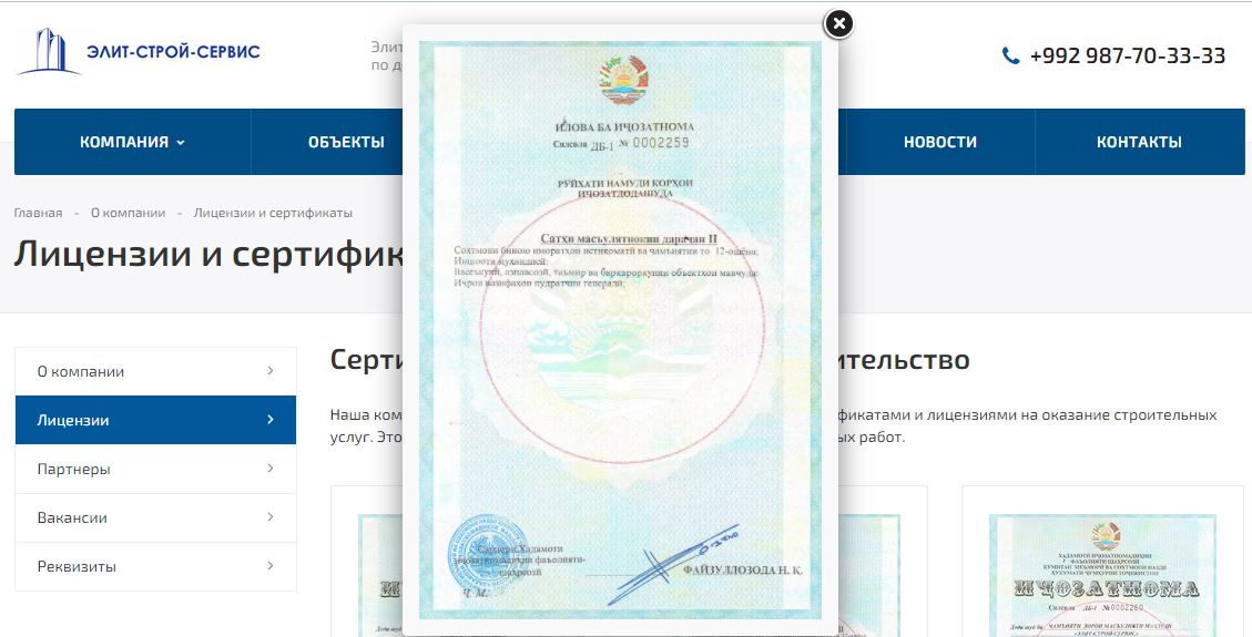 В частности «Элит-Строй-Сервис» построен 16-этажный жилой комплекс по столичному проспекту С. Айни, хотя в дополнении к лицензии («Список разрешенных видов работ») уровень ответственности данной компании значится «средний» (уровень ответственности II) и разрешается возводить общественные или жилые здания и объекты до 12 этажей.