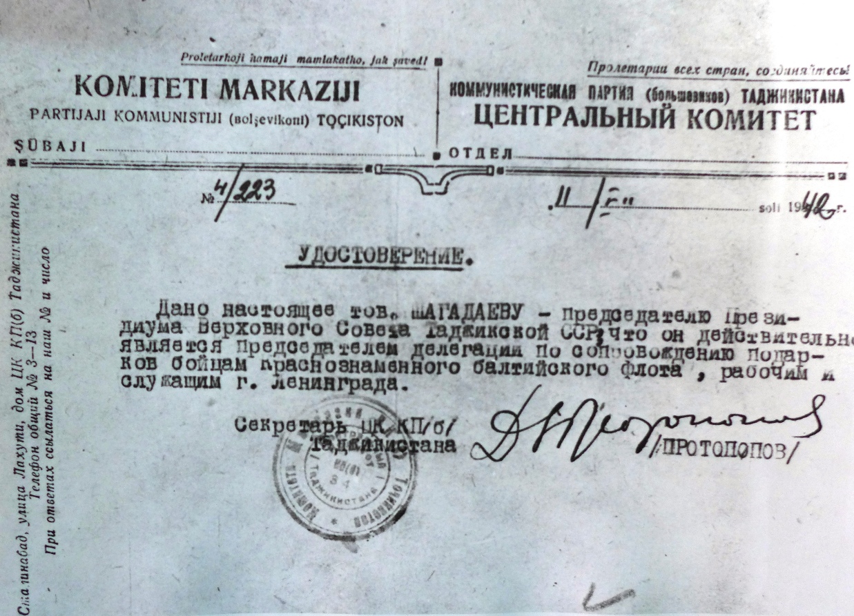 «Нет слов, чтобы выразить чувство благодарности, которым наполнены наши сердца за ваше внимание, за заботу о нас ленинградцах. … На поле битвы рука об руку с русскими братьями защищают советскую землю доблестные сыны таджикского народа».
