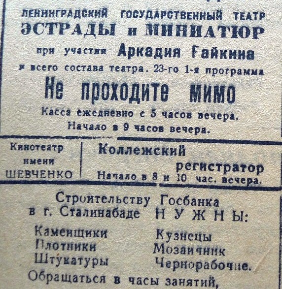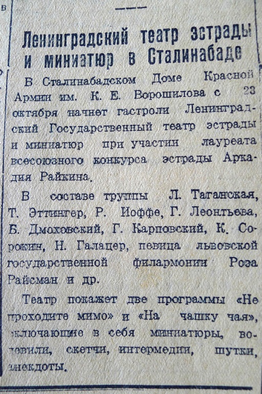 В октябре — декабре 1941 г. в Душанбе (Сталинабад), спасаясь от ужасов войны, стали прибывать из оккупированных немецкими войсками районов эшелоны с эвакуированными театральными коллективами.