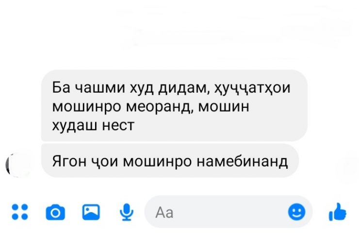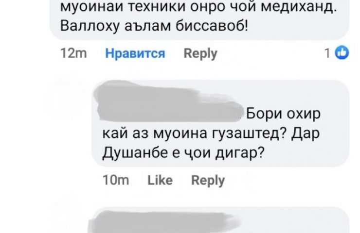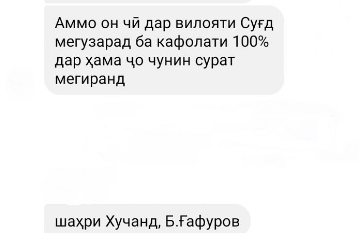 10 декабря 2020 года автор побеседовал по телефону с другим сотрудником «Рушди Рохнавард» по имени З.Г., которая представилась как заместитель директора компании Джунайдулло Ширинова, а потом уточнила, что является бухгалтером «Рушди Рохнавард», сказала, что ее руководитель был заражен коронавирусом и, к тому же, «сломал ногу».