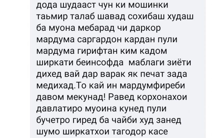 ЗАО «Рушди Рохнавард», несмотря на требования закона, не захотело предоставлять информацию о своей деятельности. Также там не пояснили, каким образом можно выдавать соответствующий акт о прохождении технического осмотра при отсутствии автомобилей и за какую тогда услугу они взимают по 250/350 сомони.