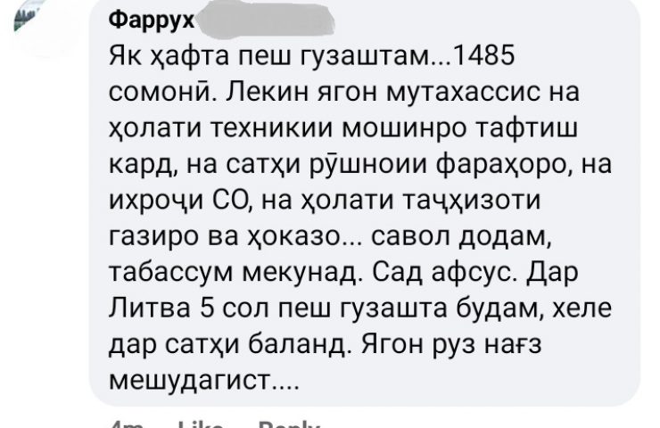 Однако водители из Душанбе, а также Согдийской и Хатлонской областей сообщили, что в их документах технического осмотра стоит штамп ЗАО «Рушди Рохнавард». Согласно информации на веб-сайте Налогового комитета Таджикистана, вышеуказанная организация зарегистрирована в налоговом органе 10 мая 2019 года, ее ИНН 040055515.