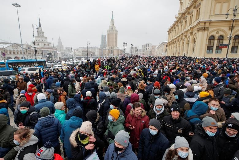 В Москве протестующие устроили шествие к «Матросской тишине», где находится Навальный — и обратно к площади трех вокзалов.