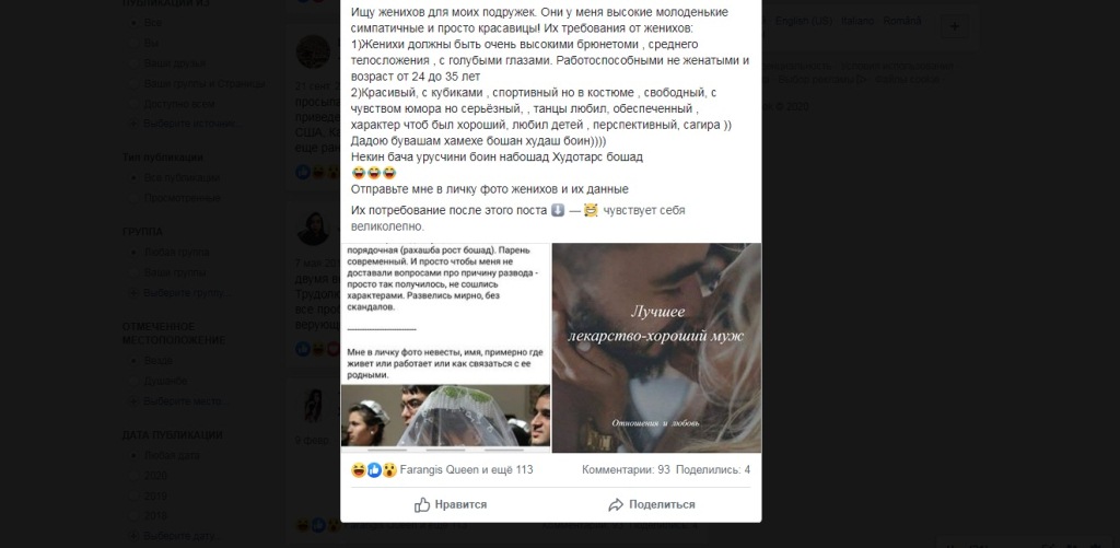 С недавних пор в Таджикистане искать невест стали искать через Facebook. Объявления в группах размещают в основном потенциальные золовки или отцы для своих сыновей и дочерей. Из критериев главный как обычно – воспитание и порядочность. Семья, из которой выходит девушка тоже важна.
