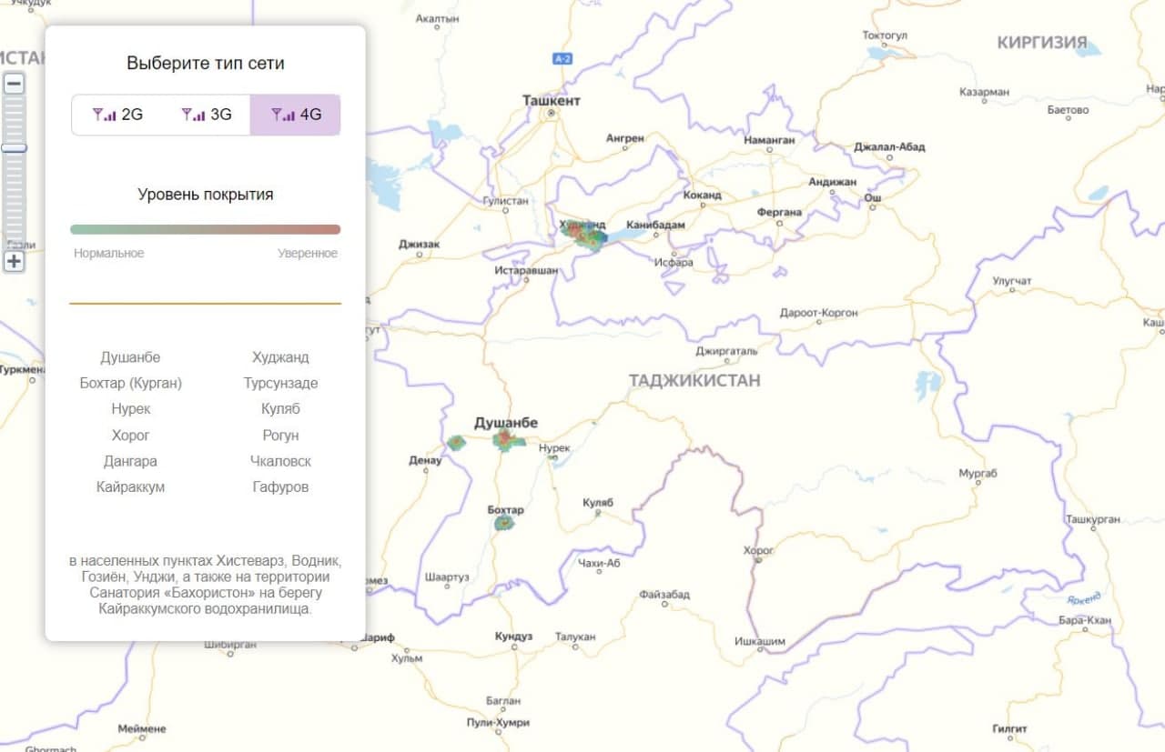 На карте покрытия 4G компании "Мегафон Таджикистан" можно увидеть, что этой сетью обеспечены город Душанбе, Худжанд, Пенджикент, Истаравшан и Исфара.