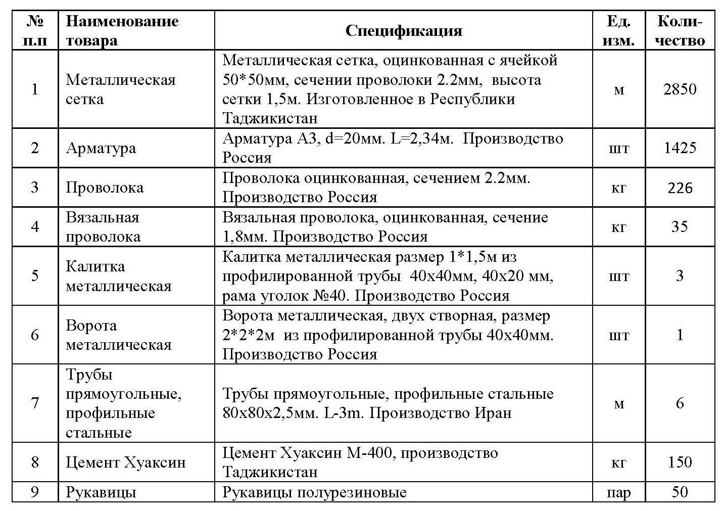 Программа Поддержки развития обществ горных регионов (ППРОГР) — проект Фонда Ага Хана в Таджикистане, при финансовой поддержке Швейцарского Агентства по развитию и сотрудничеству (SDC), в рамках проекта «Интегрированный подход к улучшению здоровья и среды обитания» в Раштской долине приглашает всех заинтересованных, правомочных лиц подать заявки в запечатанных конвертах на поставку строительных материалов в село Сайрон Ляхшского района. Наименования и спецификации приведены в таблице: