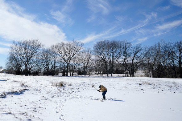 Фермер пробивает лед, чтобы напоить скот. Район около города Биг-Спринг, 16 февраля