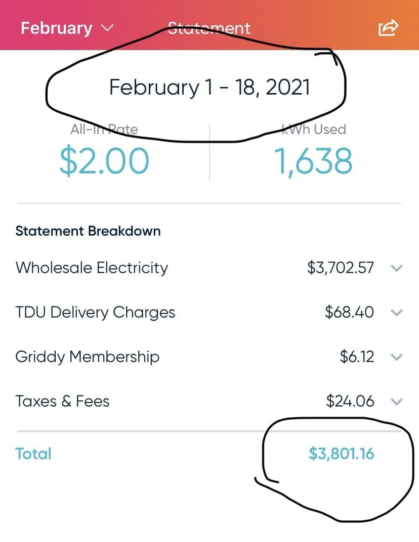 А местные жители на фоне холодов начали получать счета за электричество на тысячи долларов. Дома в США обычно обогреваются питающейся от электросети системой кондиционирования. При этом многие используют не фиксированный, а гибкий тариф – а оптовая стоимость электричества взлетела из-за бешеного спроса с $50 до $9000.