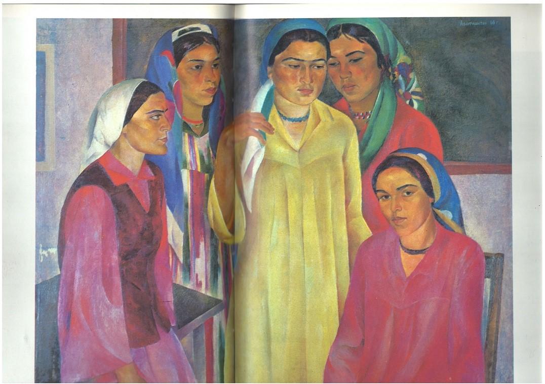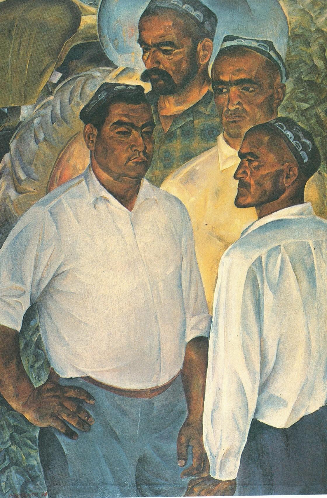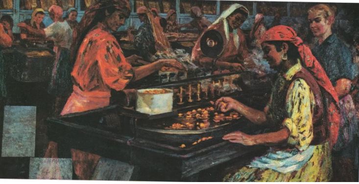 То есть уже тогда даже при декларированном равноправии полов существовали женские и мужские профессии: все что касалось механизированного труда – это мужчины, все что касалось ручного руда – это женщины. Возможно, и существовали женщины водители машин, но на полотнах таджикских художников их нет.