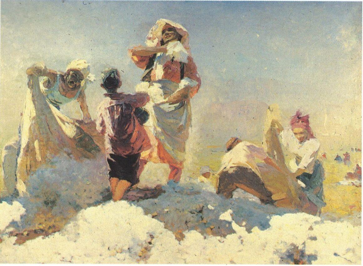 Все хлопкоробы, собиратели табака являются женщинами, нет ни одного мужчины, собирающего вручную хлопок или табак среди образов полотен таджикских художников.