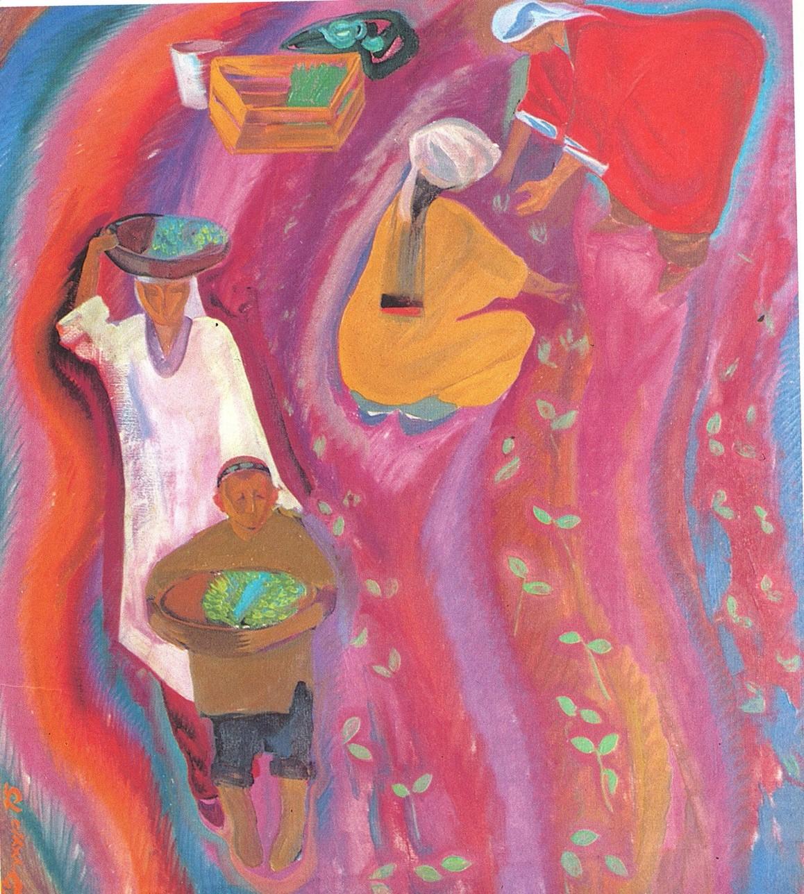 Не сильно отличается отражение трудящихся людей и у художниц. Любовь Фроликова (1949-2002) изображает женщин загоревшими от палящего солнца на хлопковых полях, и они ничем не проявляют усталость.