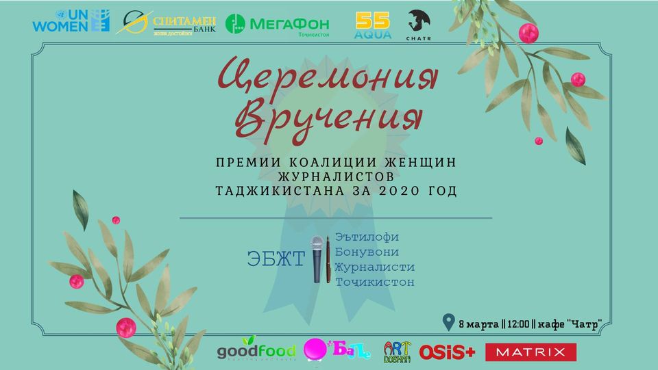 Коалиция женщин журналистов Таджикистана приглашает всех коллег на Церемонию вручения Премии в номинациях: лучшая онлайн-публикация, радио и видео работы за 2020 год.