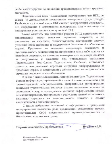 По истечению 4 часов после публикации «Азия-Плюс» позвонили специалисты НБТ с претензиями, что информация о том, что «НБТ после запуска Национального процессингового центра по денежным переводам без открытия банковского счета располагает всеми возможностями для определения отправителя и получателя практически любого перевода» не соответствует действительности.