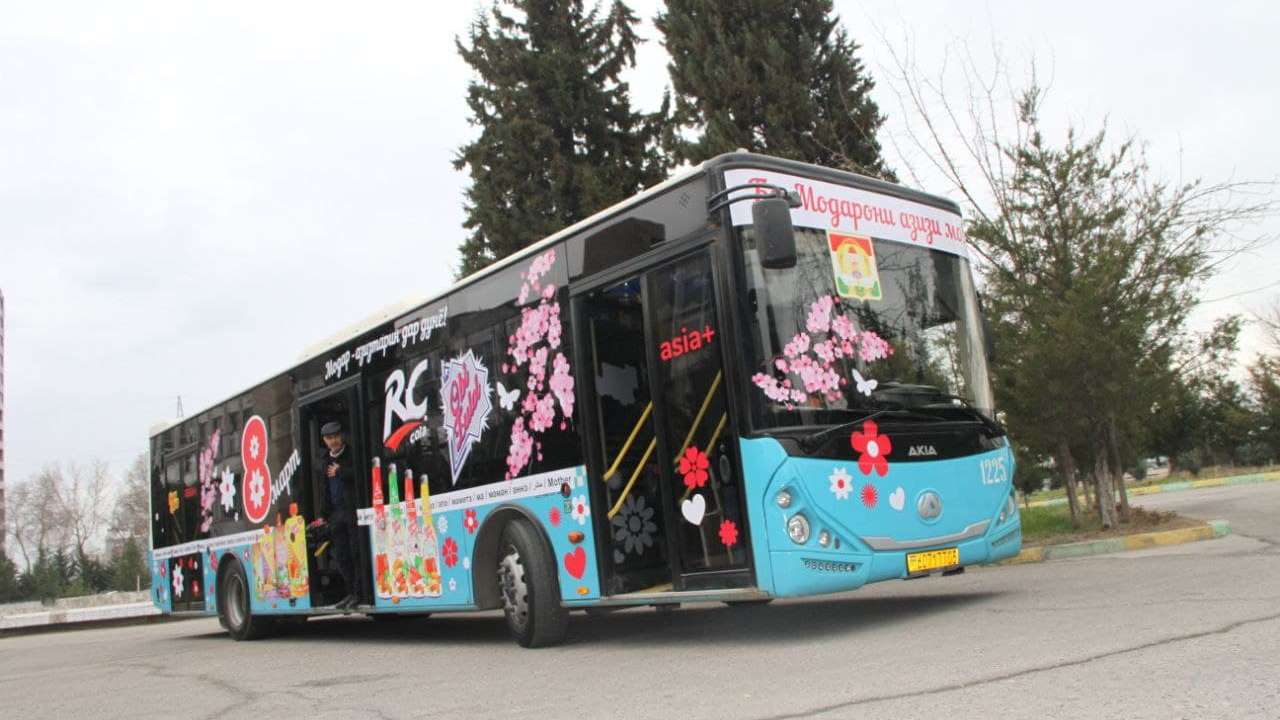 По дорогам Душанбе движется украшенный праздничный автобус, который бесплатно подвозит милых дам, а также порадует их подарками.