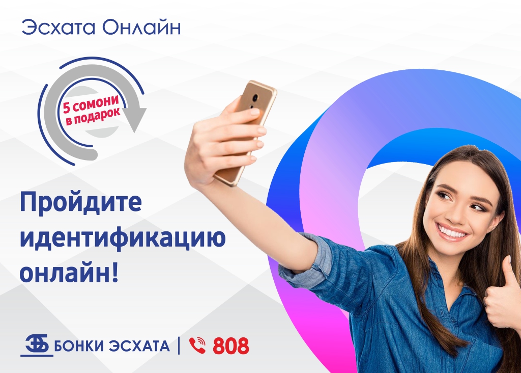 Установили мобильный банк «Эсхата онлайн» и хотите пройти идентификацию? Пройдите идентификацию в мобильном банке «Эсхата онлайн» дистанционно, без посещения Банка и получите 5 сомони в подарок на свой счет!