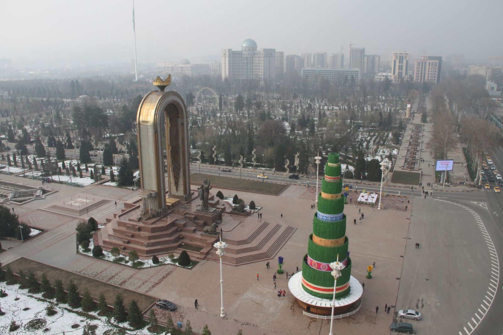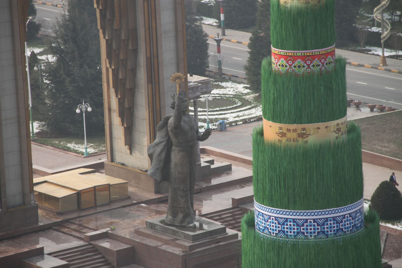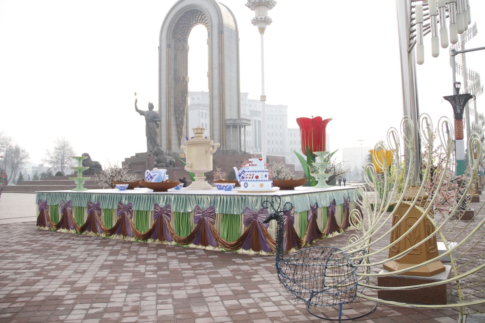 В Душанбе завершено украшение главной площади страны к празднику весеннего равноденствия – Наврузу. На площади «Дусти» установлен 30-метровый символ Навруза — суманак (пророщенная пшеница, из которой готовят праздничное блюдо) и другие атрибуты Навруза.