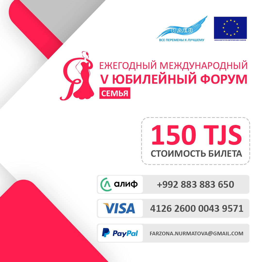 Билет стоит 150 сомони. Оплатить можно переводом на Алиф кошелек +992 883883650, на paypal [email protected] или переводом на visa card 4126 2600 0043 9571.