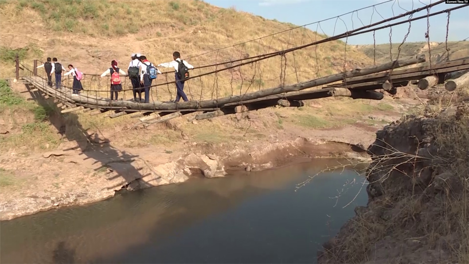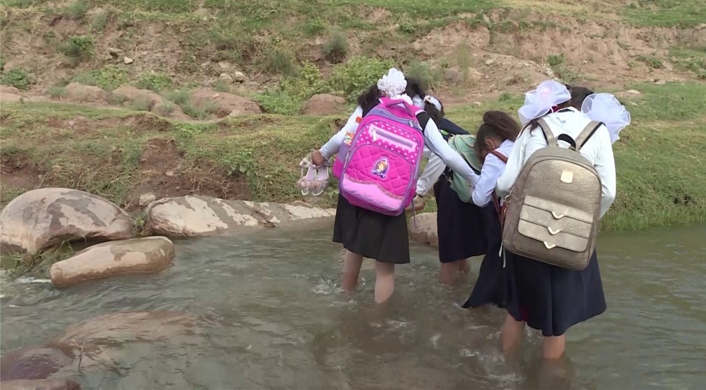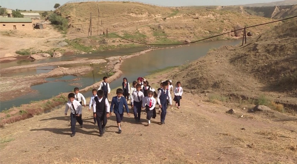 А вот так в школу, которая находится в трех километрах, добираются школьники поселка Бозорбой Бурунов. В их поселке школы нет. Дети каждое утро проходят пешком по тропам и бездорожью. Хотя со школьной формой у них все в порядке.