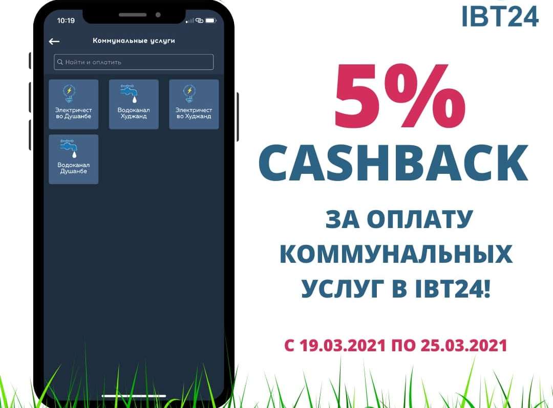 Оплачивая счет за коммунальные услуги мобильным банкингом IBT24, Вы не только освобождаетесь от комиссии, но и получаете 5% CASHBACK!