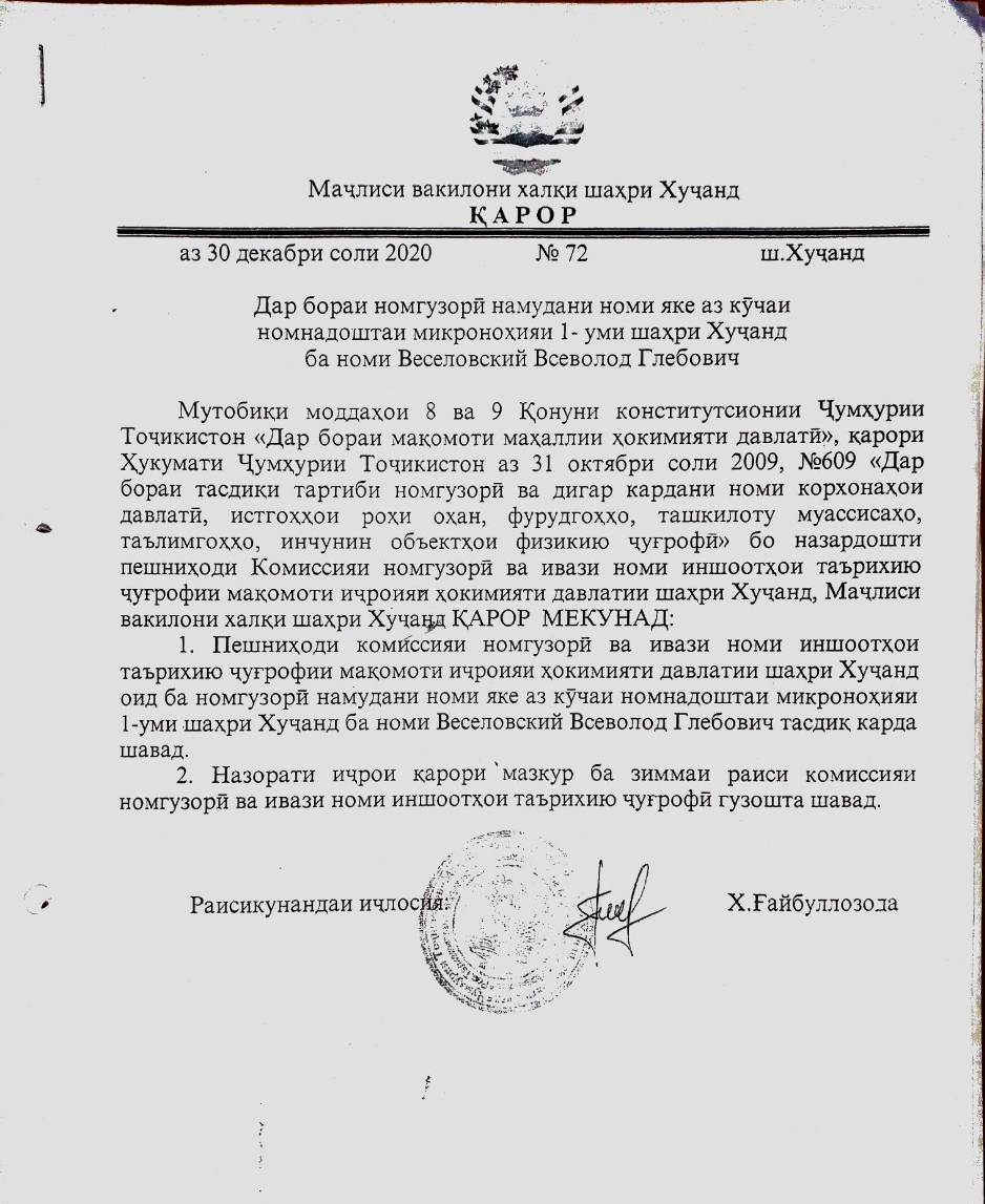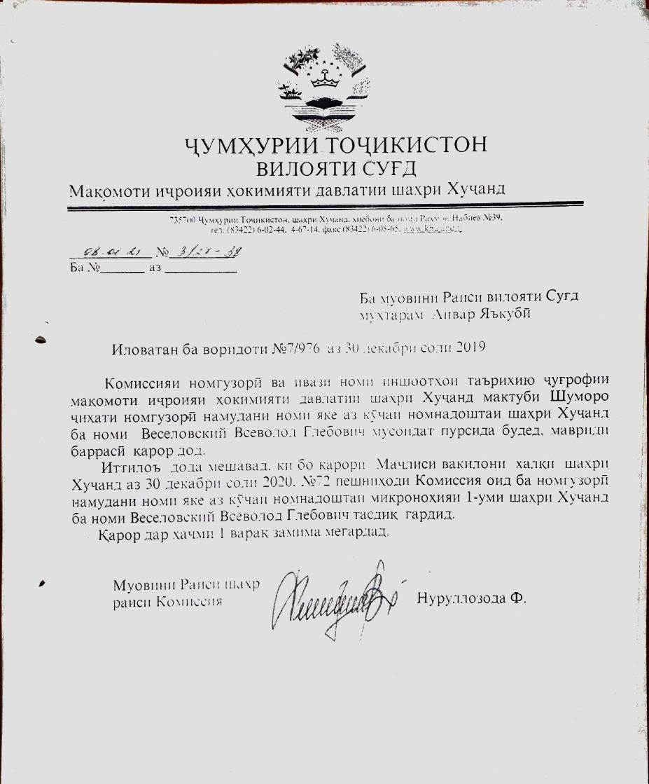 Автор выражает искреннюю признательность Председателю Союза архитекторов Таджикистана Бахрому Юсупову, депутатам городского собрания города Худжанда и всем его жителям за увековечивание памяти выдающегося архитектора Таджикистана — Всеволода Глебовича Веселовского.