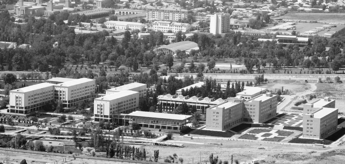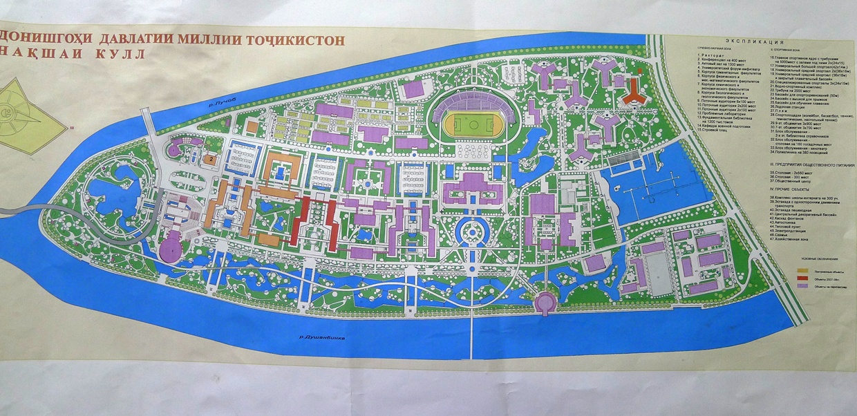 Местоположение нового университетского городка было выбрано в начале 70-х годов. На стрелке, где сливаются реки Лучоб и Варзоб в живописном месте у слияния двух рек на вытянутом треугольном участке (82 га) посреди причудливого гидропарка в обрамлении красочных альпинариев построены учебные корпуса университета.