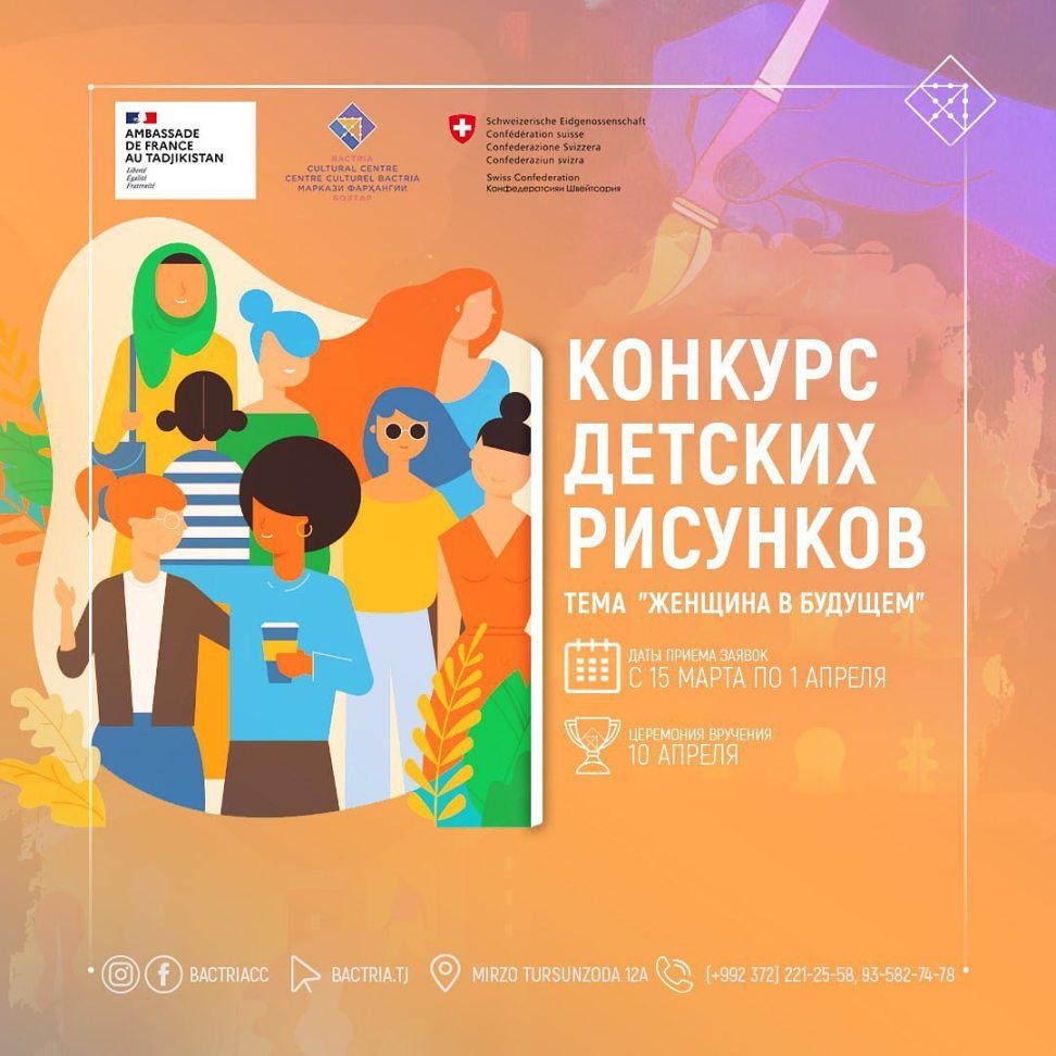В рамках «Дней Франкофонии» КЦ «Бактрия» совместно с посольством Франции и Швейцарским Офисом по Сотрудничеству в Таджикистане проводит конкурс рисунков на тему «Женщина в будущем». Принимать участие могут дети и подростки до 14 лет.