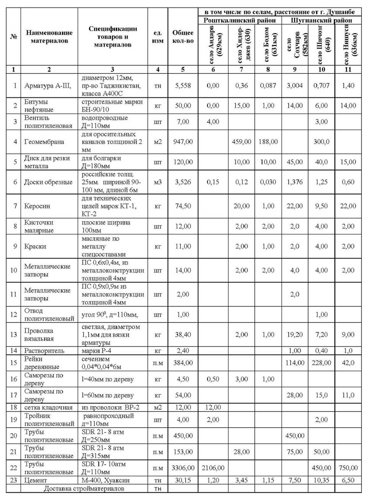 Программа Поддержки Развития Обществ Горных Регионов (ППРОГР)- проект Фонда Ага Хана в Таджикистане, при финансовой поддержке Фонда Агахана США в рамках проекта THRIVE “Процветание Таджикистана: партнёрство в социально-экономическом развитии” в Горно Бадахшанском Автономной Области» приглашает всех заинтересованных, правомочных лиц подать заявки в запечатанных конвертах на поставку строительных материалов, наименований, спецификации и место доставки, которых указано в таблице:
