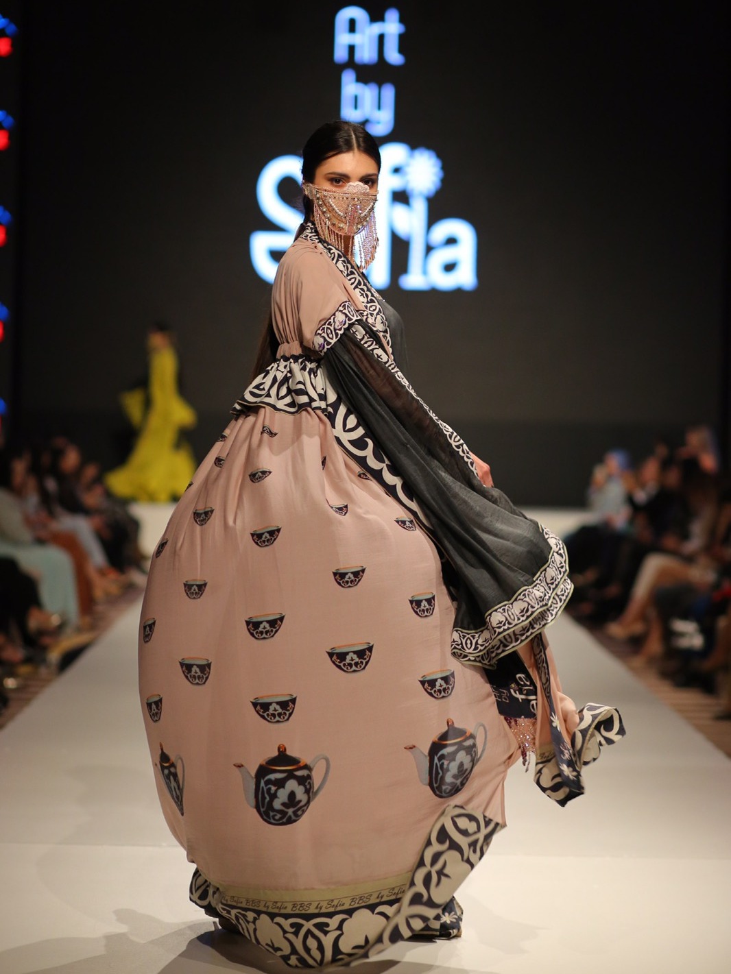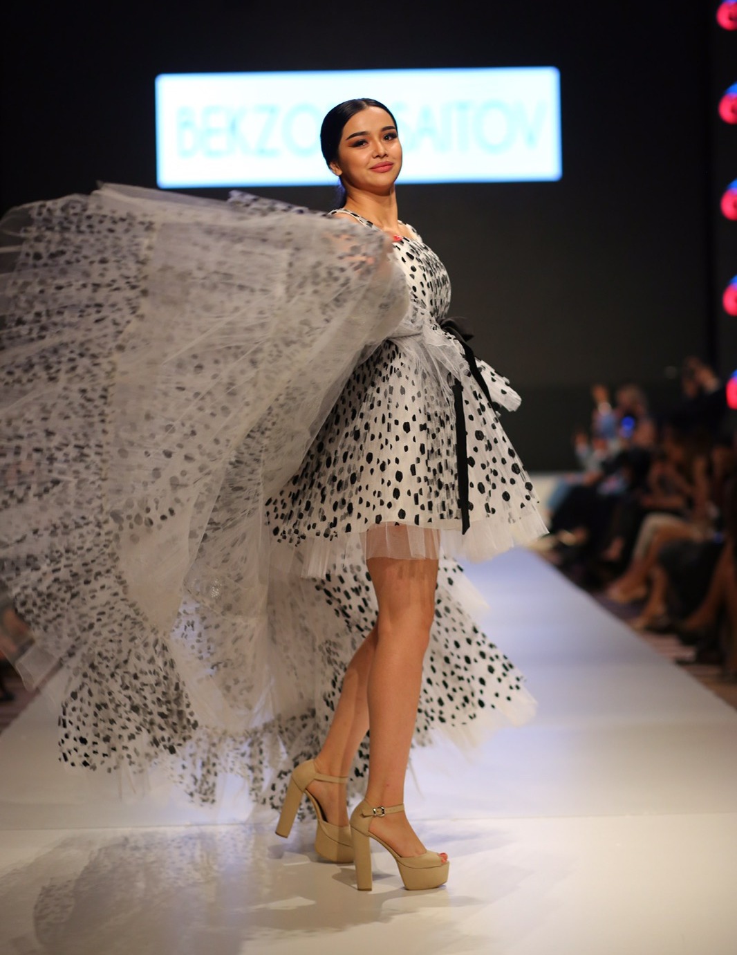 Далее с пресс-конференции гости перенеслись в креативно оформленный зал со спецэффектами и подиумом длиной в 25 метров. Через считанные секунды на нём появилась первая модель, одетая в белоснежную рубашку и кафтан сверху, расшитый национальным орнаментом и украшенный в виде аппликации камнями Swarovski. Ее голову украшал свадебный головной убор «коши тилло», в которой лицо модели было похоже на жемчужину.