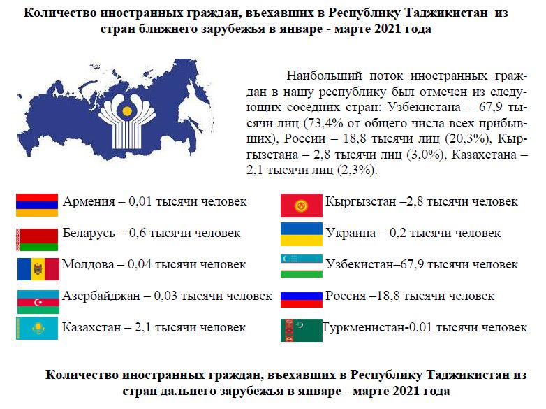В целом, в первом квартале нынешнего года Таджикистан по различным целям (деловая поездка, отдых и прочее) посетили чуть более 100 тысяч иностранных граждан, что на 66% меньше, чем в этом же периоде 2020 года.