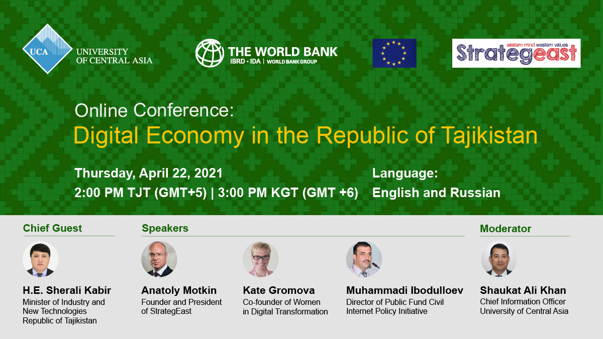 Университет Центральной Азии (УЦА) в сотрудничестве со Всемирным банком, Европейским союзом, StrategEast и Министерством промышленности и новых технологий Таджикистана организует онлайн-конференцию по цифровой экономике в Таджикистане.