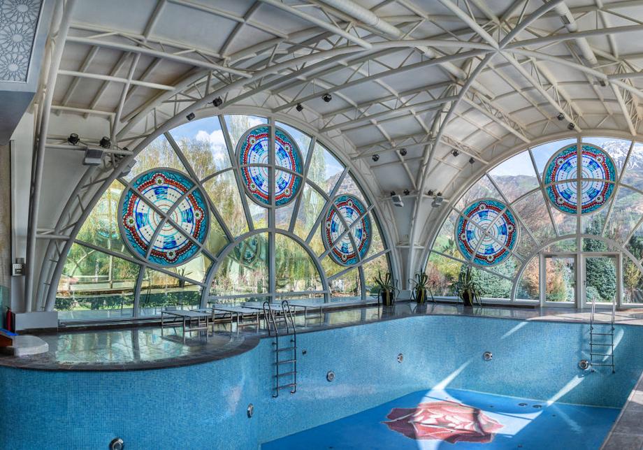 На территории комплекса расположены здание гостиницы, несколько бассейнов, амфитеатр под открытым небом, VIP-коттедж, водонапорная башня, смотровые площадки, и другие сооружения. Большинство зданий имеют оригинальное архитектурное решение, по форме напоминают большую юрту с прозрачным куполом или «летающую тарелку».