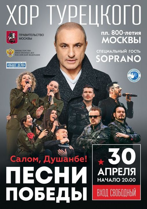 Легендарные российские коллективы «Хор Турецкого» и SOPRANO представят в Душанбе масштабный миротворческий проект «Песни Победы» 30 апреля.