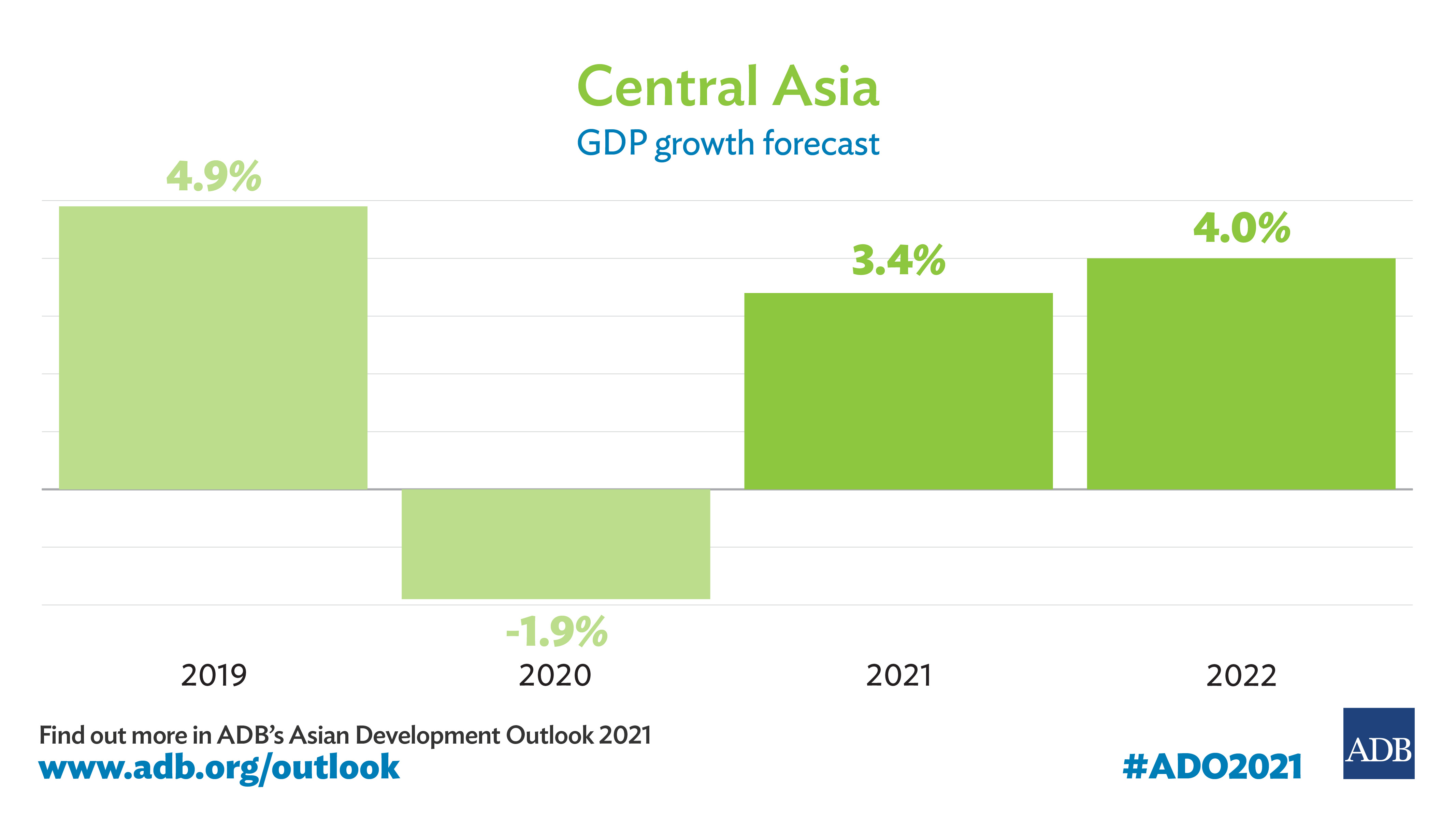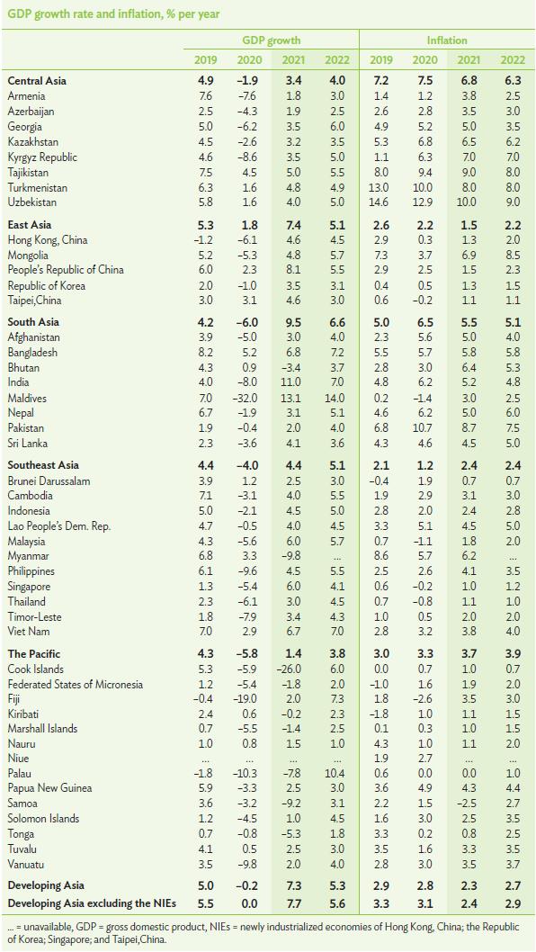 В «Обзоре развития Азии 2021» АБР прогнозирует рост валового внутреннего продукта (ВВП) Таджикистана на уровне 5,0% в 2021 году и 5,5% в 2022 году по сравнению с 4,5% экономического роста, о котором заявлено в 2020 году. «Обзор развития Азии» — это ведущее годовое экономическое издание АБР.
