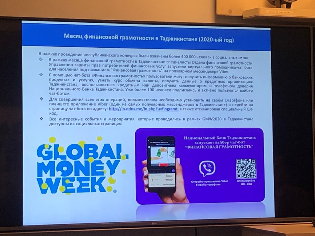 Она также рассказала об успешной опыте сотрудничества Группы Всемирного Банка с Департаментом защиты прав потребителей НБТ в вопросах разработки Стратегии по финансовому образованию,  и особо подчеркнула важность огромной поддержки со стороны регулятора в лице Национального банка Таджикистана и донора — Правительства Швейцарии в лице SECO — финансировавшего оба проекта и всецело разделяющего идею необходимости повышения уровня финансовой грамотности населения и его вовлеченности в использование цифровых финансовых услуг.