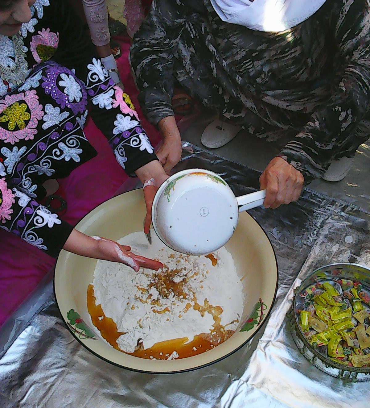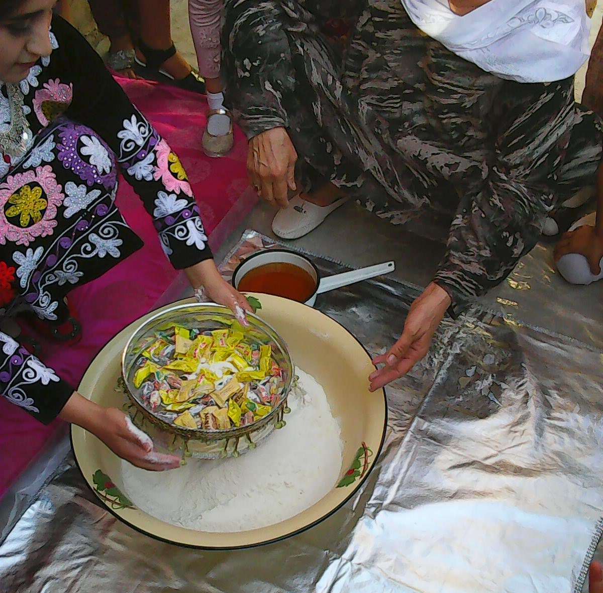 В Кулябе (как и в некоторых других регионах) в доме жениха невеста в течение 5-7 дней считается гостьей, поэтому ничего не делает на кухне. Затем свекровь и бабушка мужа окунает её руки в масло, а затем в муку – после этого она становится хозяйкой на кухне. Тесто домешивают и пекут лепёшки.