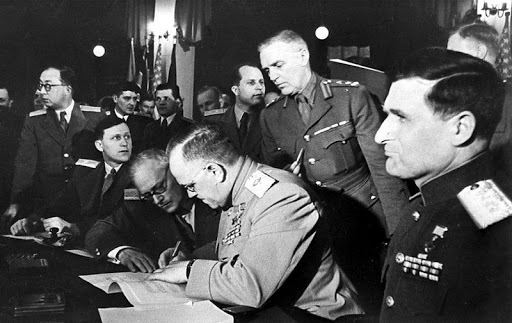 8 мая 1945 года в предместье Берлина Карлсхорсте в 22 часа 43 минуты по центрально-европейскому времени (9 мая в 0:43 по московскому времени) был подписан окончательный Акт о безоговорочной капитуляции фашистской Германии и ее вооруженных сил.