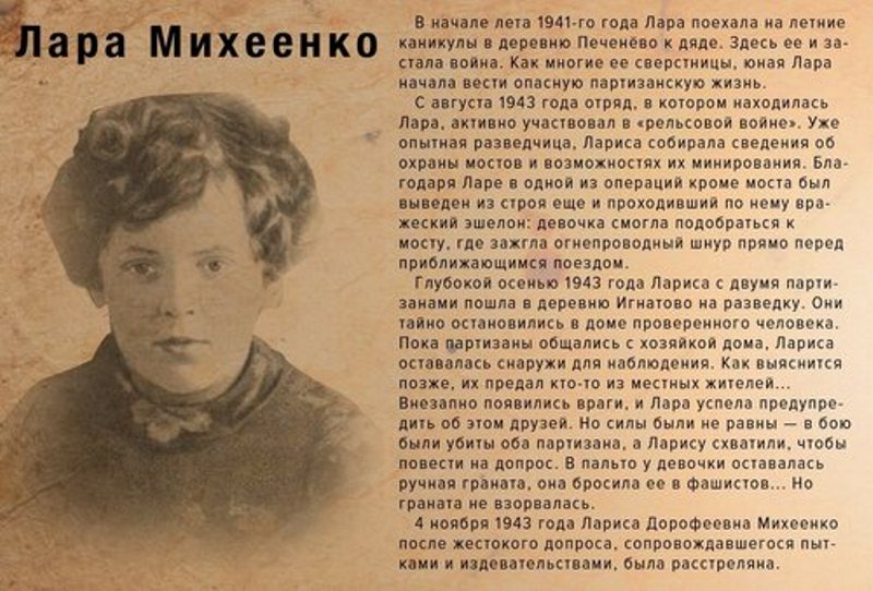 Лариса — партизанка, принимавшая участие в «рельсовой войне». Вместе с товарищами она регулярно взрывала железнодорожные линии, мосты и пускала под откос фашистские эшелоны. За свою последнюю вылазку она была представлена к правительственной награде, но получить ее не успела: она была казнена в возрасте 14 лет.