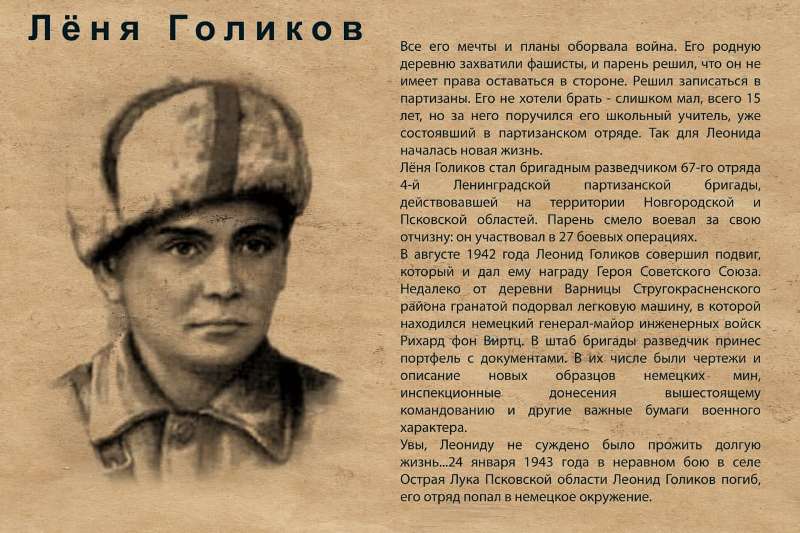 Леонид в возрасте 15 лет ушел в партизанский отряд, совершил много подвигов, и всего через год его жизнь оборвалась в неравном бою с фашистами. Он посмертно удостоен звания Героя Советского Союза.