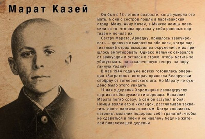 Марат — пионер-герой, юный красный партизан-разведчик. Подвиг Марата был отмечен почетной наградой – орденом Отечественной Войны первой степени, а также медалями «За боевые заслуги» и «За отвагу». В 1944 году начинается операция «Багратион», благодаря которой Беларусь освободили от фашистских захватчиков, чего не смог увидеть 14-летний Марат.