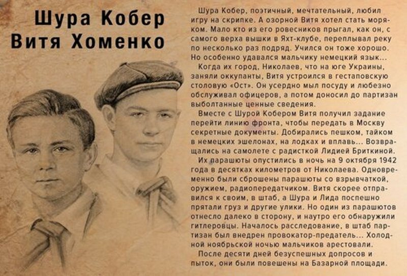 Они жили и учились в г. Николаев (Украинская ССР) в разных школах, но война навсегда сделала ребят верными друзьями и защитниками Родины. Шура Кобер и Витя Хоменко были связными, выполнявшими ответственные поручения в подпольной группе, созданной под руководством Андреева-Палагнюка. За свои подвиги Шура и Витя посмертно награждены орденами Отечественной войны I степени.