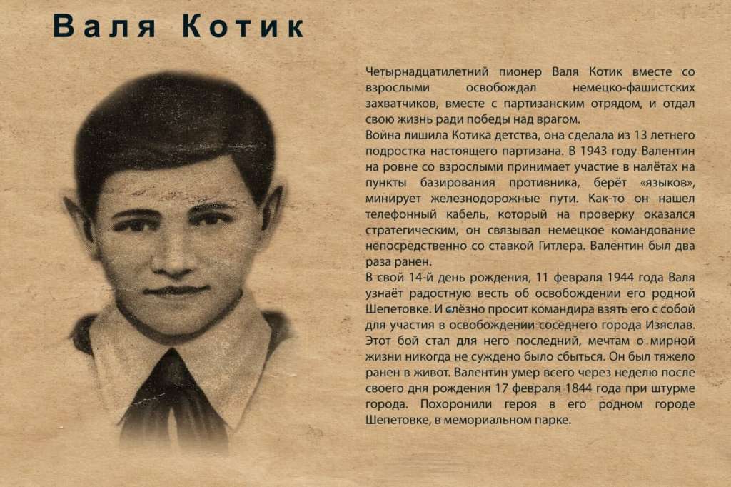 Валентин — юный герой-пионер. Валентину, искренне любившему Родину, пришлось жить по соседству с захватчиками, устанавливавшими собственные порядки. Поначалу мальчик втайне от родителей распространял листовки с военными сводками, сбрасываемые с советских самолетов, потом он со сверстниками решил помогать партизанам, прятавшимся в окрестных лесах. Однажды он на велосипеде провез мимо немцев найденный в окрестностях города пулемет. Валентин герой Советского Союза, награждён Орденом Ленина, Орденом Отечественной войны I степени, Медалью «Партизану отечественной войны» II степени — все эти награды он получил посмертно.