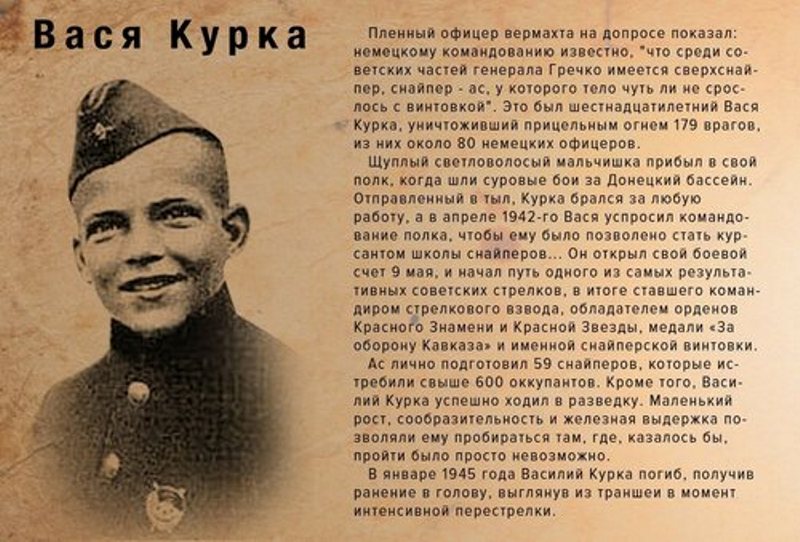 Василий — юный воин, доброволец, снайпер, командир взвода Красной Армии, в период Великой Отечественной войны уничтоживший 179 солдат и офицеров противника. В 1941 году Курке исполнилось всего 16 лет. Несмотря на столь юный возраст, Василий сумел попасть в число самых результативных снайперов тех лет. За свои подвиги на войне Василий был награждён орденами Красного Знамени и Красной Звезды, медалью за оборону Кавказа.