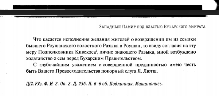 Это имя я впервые встретил четыре года назад в отчете дипломатического чиновника Туркестанского края барона Черкасова, где он отмечает, что во время поездки в Рушан в 1905 г. к нему обратились местные жители, и просили посодействовать в возврате из ссылки некого Розика.