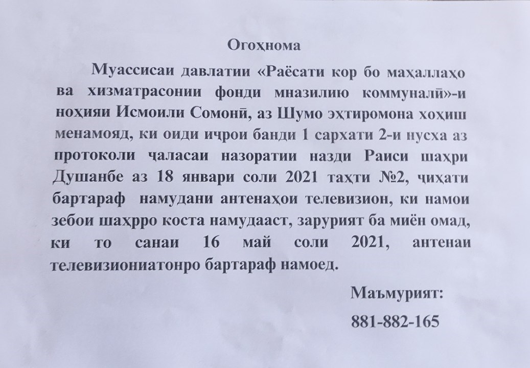 Напомним, 9 февраля текущего года жители проспекта Хофиза Шерози разместили фотографию объявления в группе «Мы Таджикистанцы» на Facebook, в котором власти призывали снять антенны с крыш домов. В случае невыполнения угрожали выкинуть имущество.