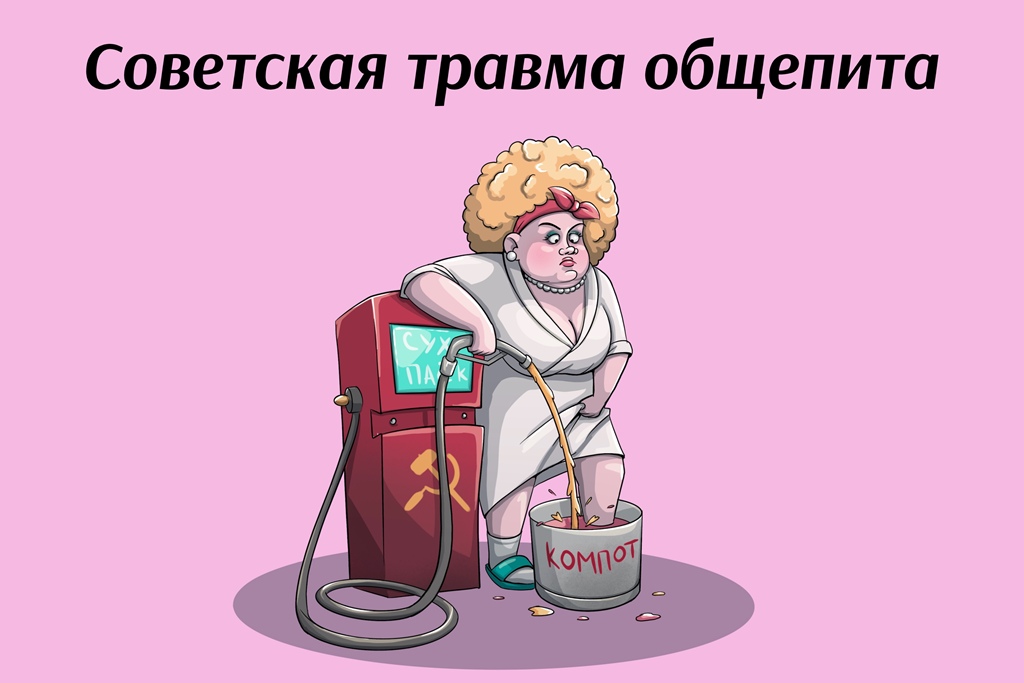 Отношение к еде в СССР было сродни отношению к топливу. Заправился и ступай пахать, точить, лечить, доить, строить дальше. Быстро и сытно – таков критерий советской кухни, чтоб утолить голод и вернуться к станку. «Сытый работник завода — надёжная опора для народа». Еда как заправка. Пища как источник калорий. Отсюда и неаппетитная лексика вроде «пищеблок» и пугающие надписи на громадных кастрюлях с сомнительным, порой, варевом «гарнир», «соус» и т.д.