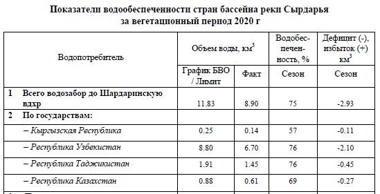 Так, в весенне-летний период 2020 года Таджикистан забрал из Сырдарьи 1 млрд 450 млн кубометров воды, что на 460 млн кубометров или 24% меньше положенного.