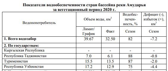 Забор воды Узбекистаном составил 6 млрд 699 млн кубометров (75% от общего водозабора), Казахстаном — 610 млн кубометров (6,8%), Кыргызстаном — 145 млн кубометров (1,6%), а Таджикистаном, как уже указали, 1 млрд 450 млн кубических метров (16,3%).